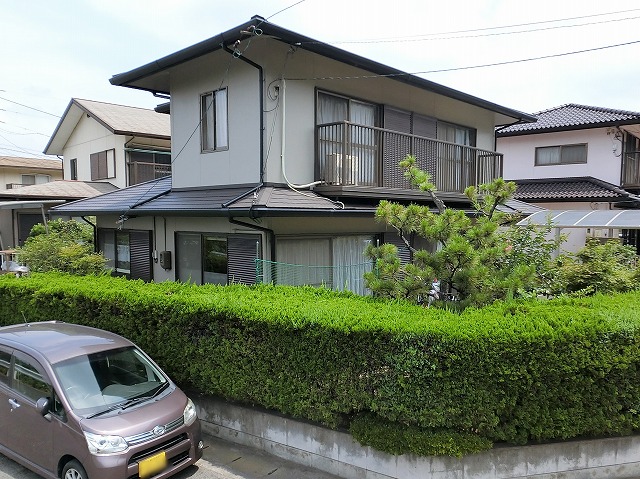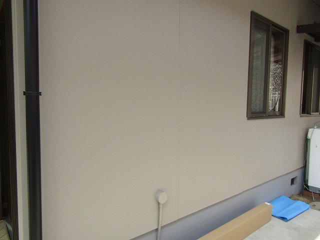今回、アウトレット塗料で塗装した外壁はこちらの色です。明るい色合いのベージュです。ベージュは色褪せも汚れも目立ちにくく、屋根や樋との色も合わせやすいのでおすすめです。