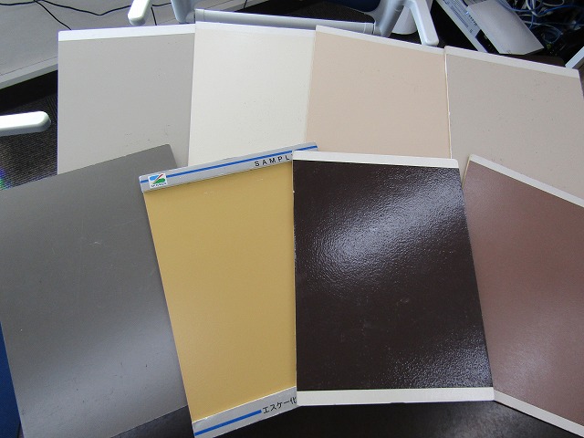 上の写真はアウトレット塗料の塗り板です。いつもこの色がそろっている訳ではありませんが、クリーム色やベージュ、グレーは在庫にある可能性が高いですよ。塗料の色を何色も組み合わせるのもオッケーです。玄関やバルコニーなど一部の色を変えてアクセントを出すのもいいですよね。