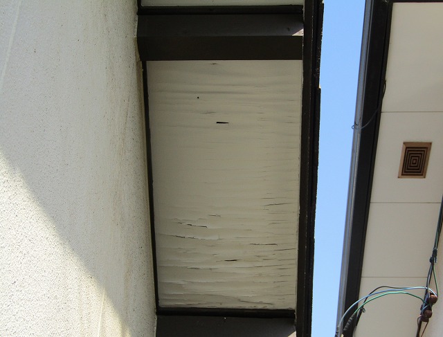 この住宅の軒天は、木がささくれていたり、ぼこぼこになっていました。これは、雨水が屋根から侵入している可能性があります。今回の工事で、屋根は葺き替えで、全部撤去し、めくるので、しっかりと屋根を修理することができます。