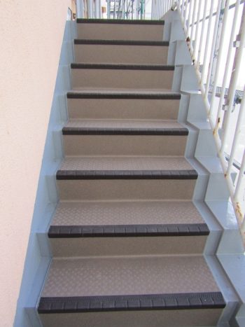 長尺シートを張ったマンションの共有階段です。角の部分は滑らないような加工がされているシートを使っています。