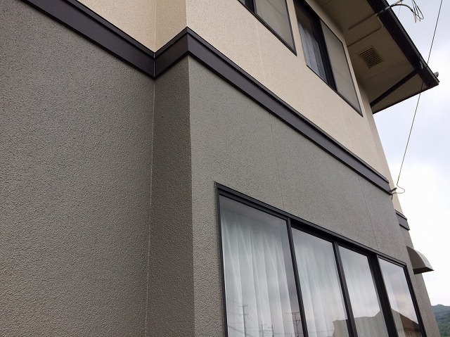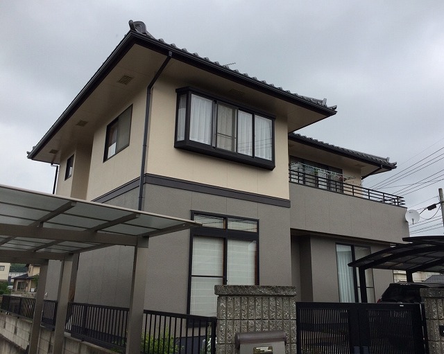既存の色はクリーム色1色だったのですが、今回の塗装で胴差を境に2色になりました。色はクリーム色とグレーで落ち着いた高級感のあるお家になりました。