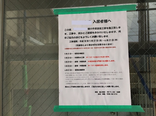 これは入居者様へ作業の日程のご連絡の張り紙です。