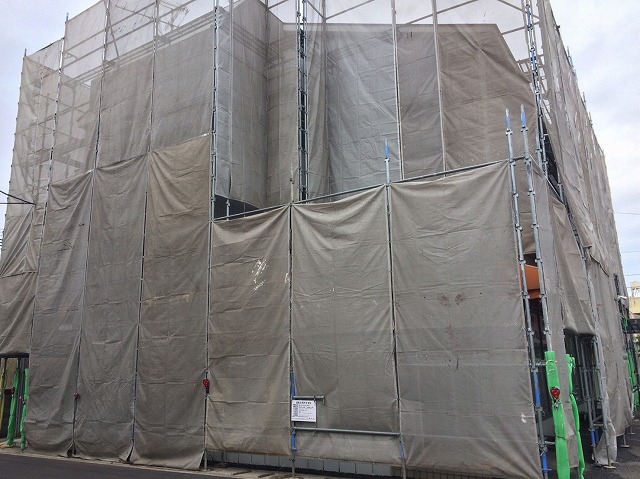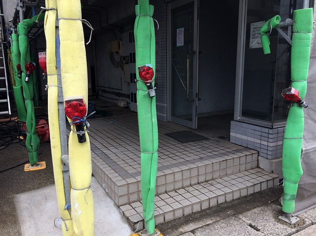 足場の鉄骨でケガをされないよう、スポンジ状のもので鉄骨を覆っています。