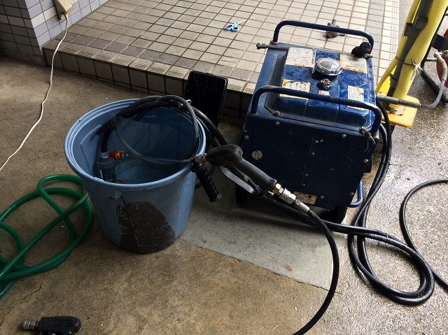 この日は”洗浄”の工事予定でした。洗浄というのは、高圧洗浄機を使用して、汚れやほこりを洗い流すことです。汚れが付いたまま塗ってしまうと、仕上がりもキレイではないし、すぐ剥がれたりしてしまいます。なので、この洗浄で完全に汚れを取り除きます。
