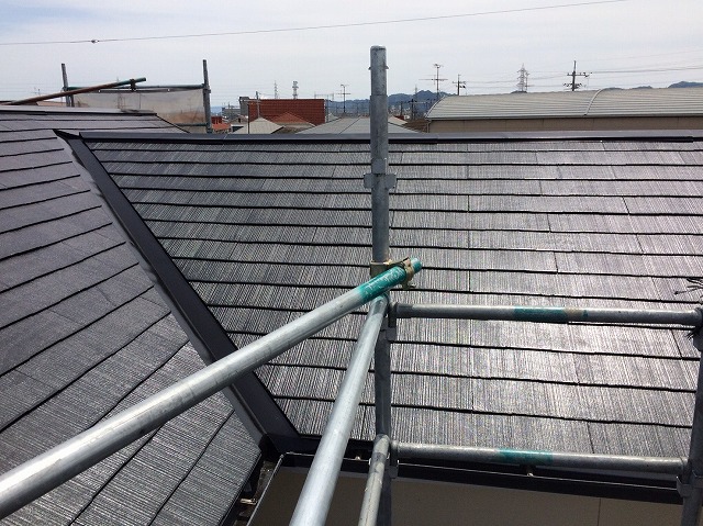 ここのお家は、屋根に無機質系塗料のセミフロンスーパールーフⅡを使用しています。屋根は外壁に比べて劣化するスピードが早いです。なぜかといいますと、屋根は太陽光・紫外線を思いっきり浴びるからです。洋服を日がよく当たるところに長い時間干すと、色あせしてしまいますよね!太陽光・紫外線は強いのです。それを屋根は毎日長時間当たっていますので、劣化も早いのです。瓦は素材によりますが、色あせや苔や藻が生えたりひび割れしたりします。塗料によって耐用年数が違いますが、例えば、外壁には10年、屋根には8年と、同じ塗料を外壁と屋根に使用して耐用年数が違うのは外壁と屋根の劣化のスピードに差があるからです。