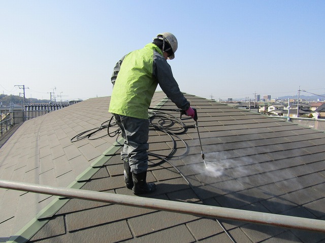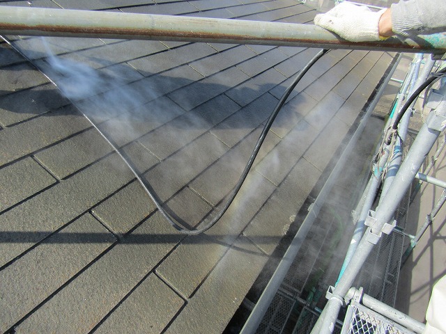 この日は「洗浄」の作業の日でした。洗浄とは、塗装の作業をする前に、高圧洗浄機を使って、汚れやほこり、苔や藻などを洗い流す作業です☆苔や藻!?と聞いて驚く人も多いはず!私も初めて聞いた時は驚きました!実際に現場で見た時も!!でも意外と多いんです💦