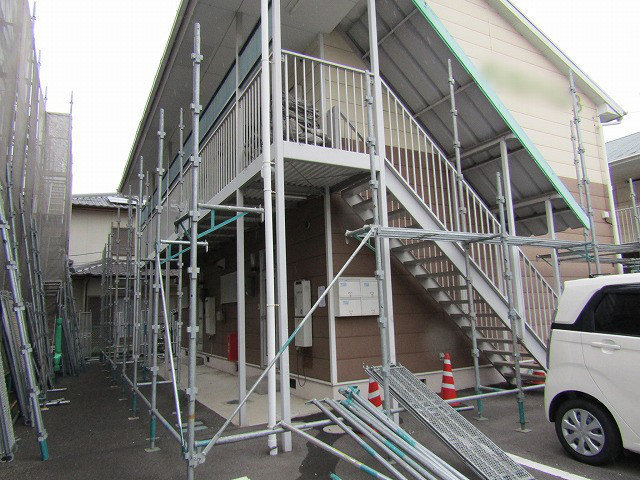 今日はB棟の足場を組んでいるのと、A棟はほとんど完成していて、階段と天井の塗装をしていました🎶
