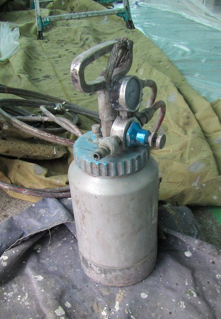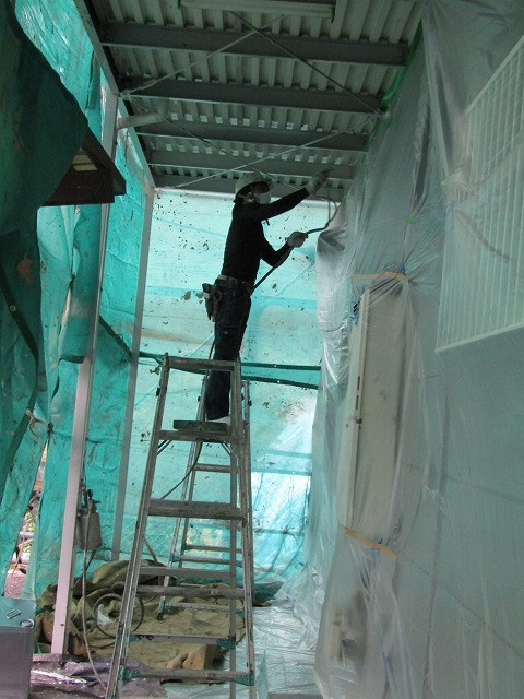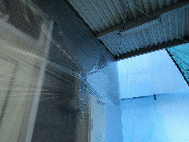 エアスプレーは、ローラーよりも飛散の量が多いので、養生を大きくしっかりとします!!