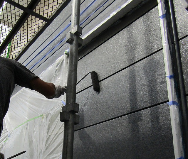 ちょうどベランダ側の壁の上塗りの作業をしているところでした。