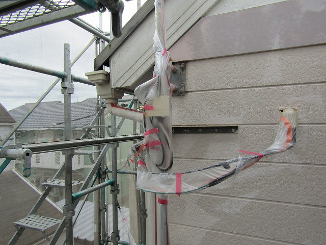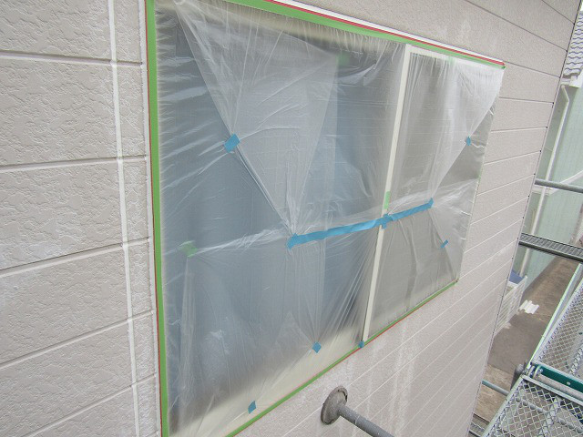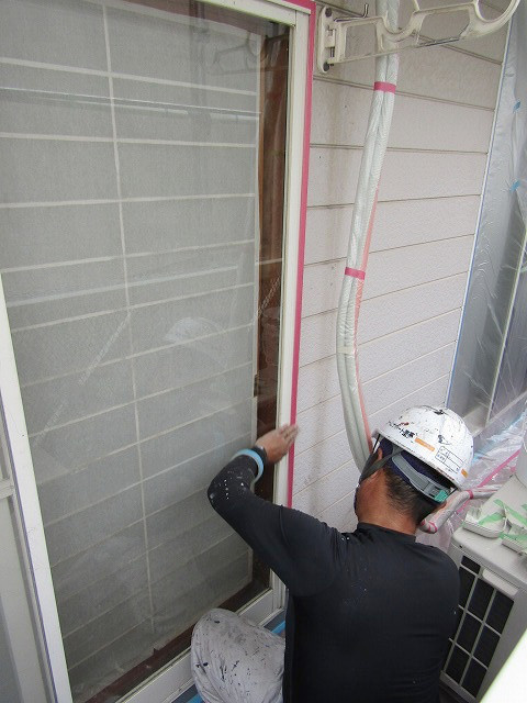 この作業は、ドアや窓、外壁の近くにあるもの全てに養生をするので、かなり時間がかかります!外壁塗装は塗る段階までの下準備がたくさんあるんです!下準備は、ケレン、シーリングの打ち替え、洗浄、ひび割れの補修、エアコンのホースを外す、そして養生です☆下準備はどれもとっても重要な工程なんですヾ(*´▽`*)ノ