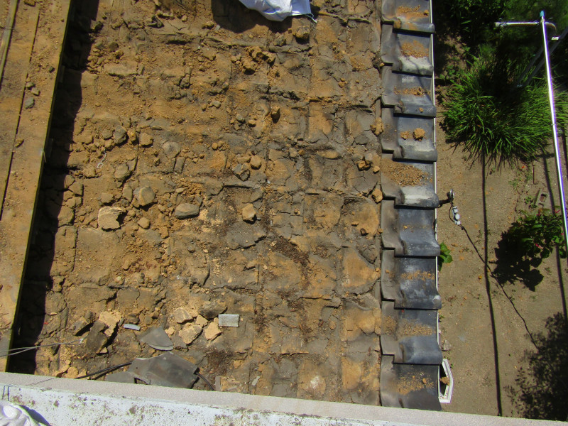 この後の作業は、防水のために敷く”ルーフィング” を撤去し、下地の板の補修をするそうです。傷みや腐食がひどい場合は新しい板に替えるそうです。それから、新しいルーフィング(防水シート)を敷いていきます。