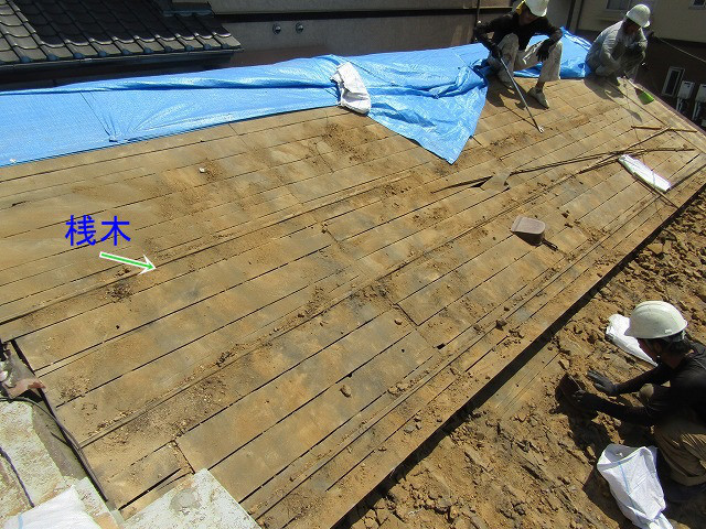 ”桟木” という日本瓦を留めるための木材を撤去しているところです