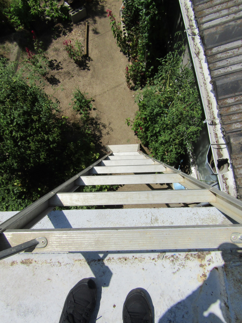 今回の現場は屋根部分だけなので、上に上がるのには階段ではなく、はしごで上がりました。