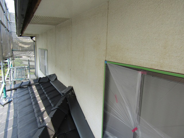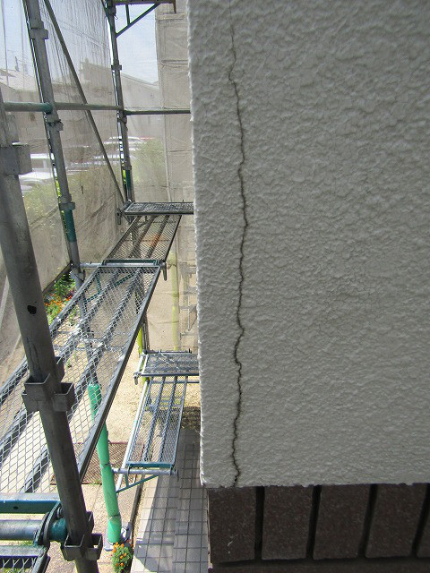 養生の後は、外壁のひび割れや目地のひび割れを補修してから、塗装をしていきます。