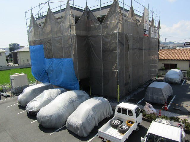 どうやら、風向きによって飛散する量や方向がかなり左右されるそうです。思った以上に飛ぶんだ・・と思ったけれど、塗夢の職人さんは、養生を、しっかり&丁寧にしているので大丈夫です !