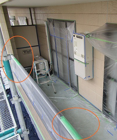上の画像の、オレンジで○をしているところ、なぜ養生テープが貼ってあるのでしょうか??それは、職人さんや、脚立や塗装の道具が出入りするから!!だそうです。出入りするときに、万が一傷が付かないように気を付けているんです。