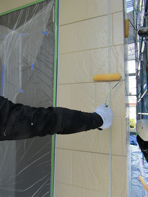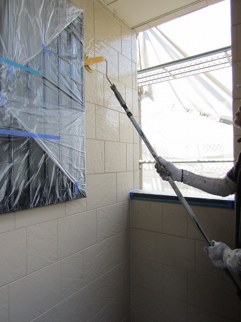 天井や、狭い、手が届かないところは長柄という棒をつけて塗っていきます。