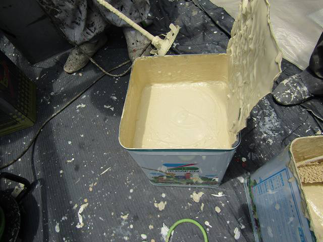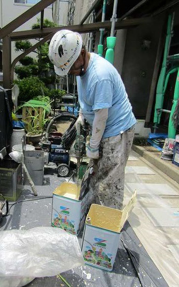正確に分量をはかることが、塗装のもちに関わってくるそうで、外壁塗装には、正確な順番と正確な分量が重要だということです。そして、上手く施工する職人さんの腕です!