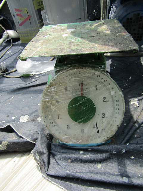 これは、塗料の硬化剤と色を混ぜるときの量を量るために使うのです。電卓を使って割合を計算して混ぜる量をはかっているそう!!