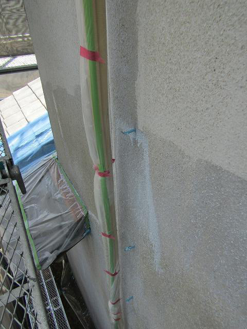 ホースの裏は、どうせ見えないから・・と塗らないトコけっこう多いらしいです。ホースを外さないで一緒に塗ってしまうと、エアコンを取り返るときに、はがれないー!!となっちゃうそうです。無理やりはがして外壁まではがれて・・・それはとても困ります!