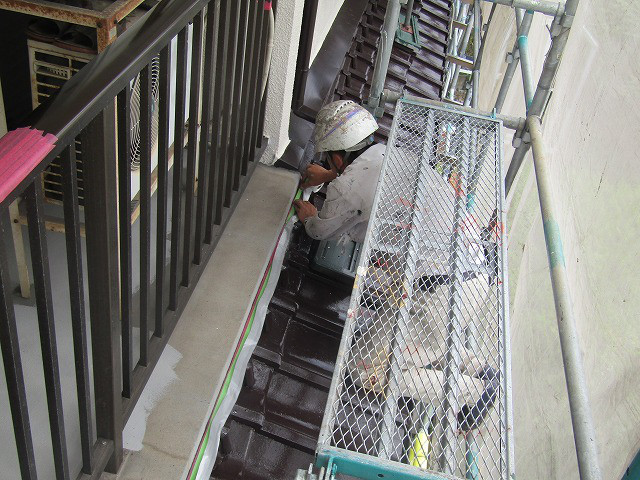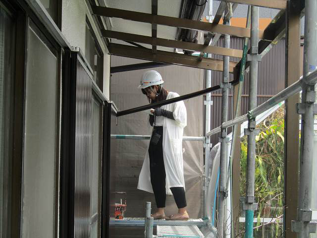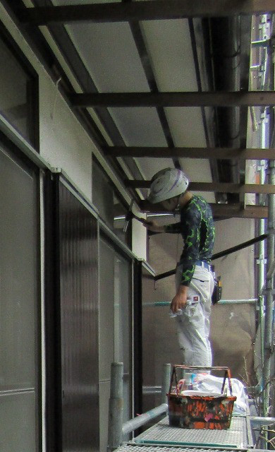 さらに階段を使って二階へあがると、ベランダのコンクリートを塗っているところでした。