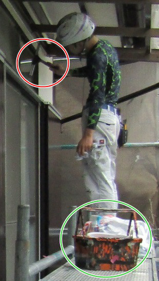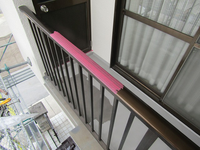 手すりのところに赤いマスキングテープが貼ってあります。しかも、一部分です。これは何のために貼っているかというと、「人や道具が出入りするので、傷がつかないため」 だそうです。