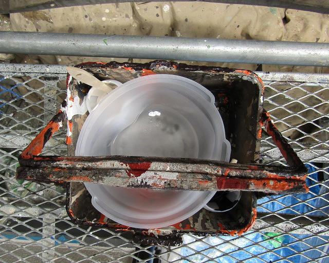 タッチアップのときには、必ず手元に置いてあるそうです!赤いバケツの中身はというと・・・