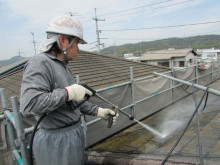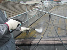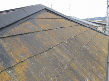 屋根の状態はかなり劣化が進行しており、高圧洗浄でしつこく洗わないと下地調整が難しい状態でした。