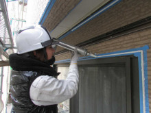 外壁目地と窓枠のシーリングを全て撤去して、新たに変性シリコンシーリングを打っています。