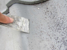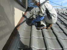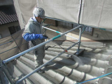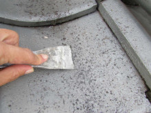 屋根の旧塗膜が膨れてきているので、ヘラで旧塗膜を剥離しています。