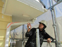 今日の作業はクリンマイルドシリコンを軒天部分に塗装しています。