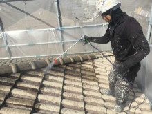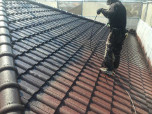 先日外壁塗装が終わり今日は屋根のモニエル瓦の仕上げ吹きです。