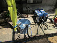 高圧で洗浄していますから汚水が流れています。