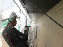 仮設工事完了が完了し屋根外壁の高圧洗浄をしています。