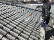 屋根の基材はセメント瓦で長年のチリ・ホコリ・コケが堆積していますので高圧洗浄で洗い流します。