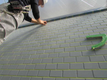 本来磁器タイルには塗装は密着しませんが、特殊な下塗り材を入れ塗装しています。目地とタイルの色を分けますから目地色のグレーを塗りマスキングして上塗りしていきます。