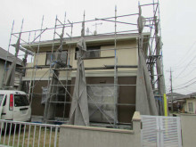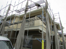 ここは一昨日足場を架け今日は外壁洗浄しています。