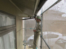 軒裏部分も慎重に洗浄しています。この部分は天井が近いため雨を漏らさないよう神経使います。