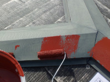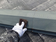 屋根の棟板金のケレンをマジックロンを使用し研磨しています。