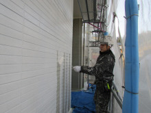 昨日から下地調整材、SDサーフエポを塗ってます。この工程を入れる事でサイディングとの密着性能が向上し軽微なクラックは抑え込んでくれます。