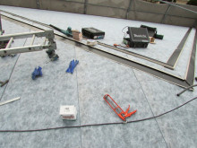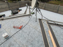 板金職人が5名入り屋根を伏せる準備作業をしています。