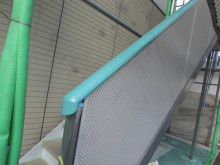 共用部の手摺もブルー系の色でクリンマイルドシリコン仕上げ。お洒落な配色となっています。