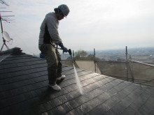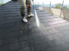 屋根は基材の下地が覗くくらい洗浄して旧塗膜を取り除きます。