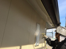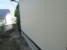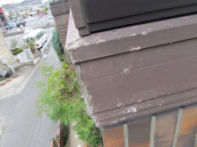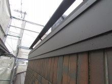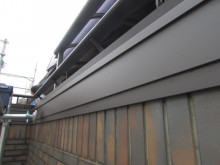 先日足場を解体し完成しました。施工前は軒天にパテ、シーリングを充填していた痕がくっきり出て汚い状態でした。また胴差は水が廻り腐食していましたから新たにガルバニュウム鋼板でカバー工法しました。