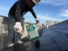 先日高圧洗浄も終わり今日は屋根のプライマー塗りと中塗り。