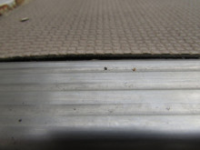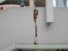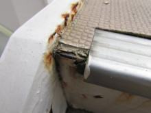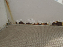 この階段は床に長尺シートを貼ってます。このシートと床のモルタルの隙間に水分が浸入し鉄部を酸化させます。裏面の塗膜が剥離するのもそのためです。