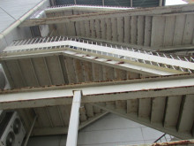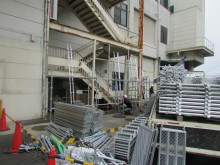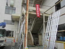 屋外階段を塗装する工事です。今日の作業は仮設工事。