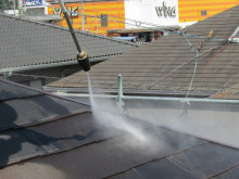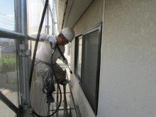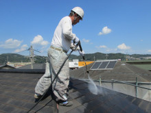 先日外壁シーリングが終わり今日の作業は屋根・外壁の高圧洗浄。