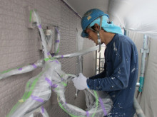 中塗りはSK化研、水性セラミシリコン。この工程が終わったらK2コート(フッ素樹脂系光触媒)をスプレーします。