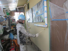先日破風・鼻隠し等の錆び止めが完了し本日の作業は中塗り。塗装しているのはSK化研クリンマイルドシリコン3部艶有り。